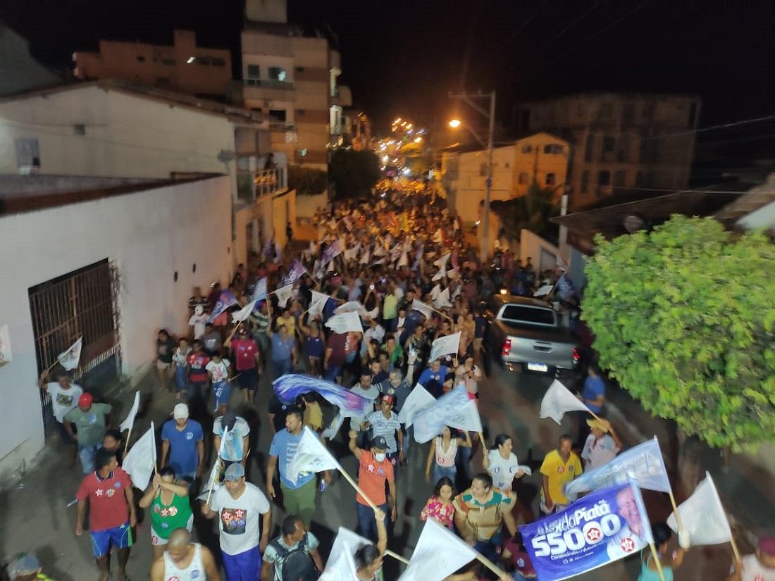 Uma multidão se reuniu na Praça Castro Alves, onde fica a prefeitura e a Câmara de Vereadores com bandeiras, carro de som e um minitrio para recepcionar o deputado.
